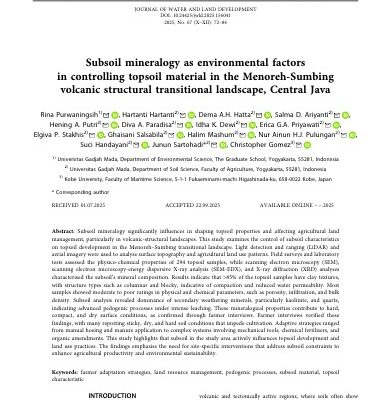 Purwaningsih, R.; Hartanti, H.; Hatta, D.A.H.; Ariyanti, S.D.; Putri, H.A.; Paradisa, D.A.; Dewi, I.K.; Priyawati; E.G.A.; Stakhis, I.P.; Ghaisani, S.; Mashum, H.; Pulungan; N.A.H.J.; Handayani, S.; Sartohadi, J.; Gomez, C.. 2025. Subsoil mineralogy as environmental factors in controlling topsoil material in the Menoreh-Sumbing volcanic structural transitional landscape, Central Java. Journal of Water and Land Development…
