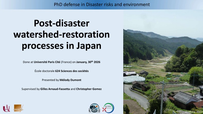 ErosionStudentMelody Dumont successfully defended her PhD at Paris University and Kobe University on January 30th 2026. kaikikazanbear1 month ago1 month ago01 mins (Incomplete preliminary PDF) Melody_PresentationPhDDownload Post navigation Previous: 新国際論文: Assessing Grain Production Eco-Efficiency under Rural Land Management Institutions: A Hybrid Analytical Framework (Socio-Economic Planning Sciences IF 6.82)Next: 新英論文: C. Gomez. 2026. Airborne Lidar for Post-Disaster Recovery in Japan – Lessons from coseismic landslides and lifeline impacts in the aftermath of the January 1st 2024 Noto Peninsula Earthquake. British Geological Survey Geohorizons