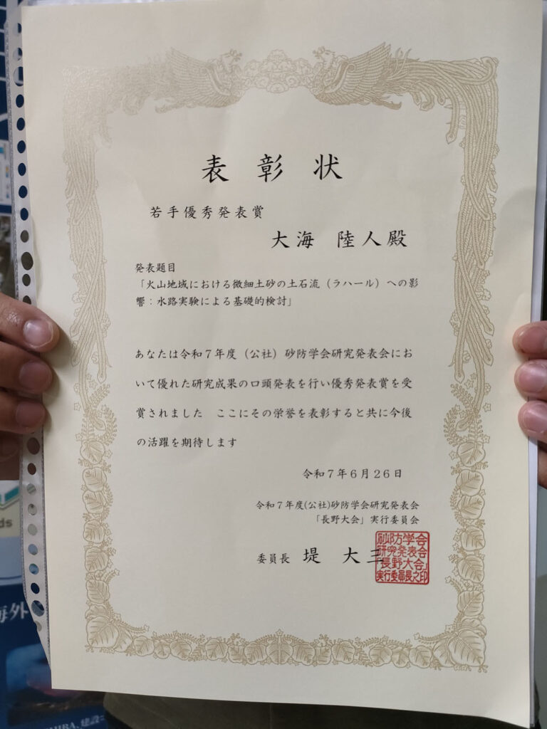海事科学研究科・ゴメス教授の砂防研究室に所属する博士後期課程2年の大海陸人さんが、令和7年度 公益社団法人砂防学会研究発表会(長野大会)において、「若手優秀発表賞(発表賞)」を受賞しました。